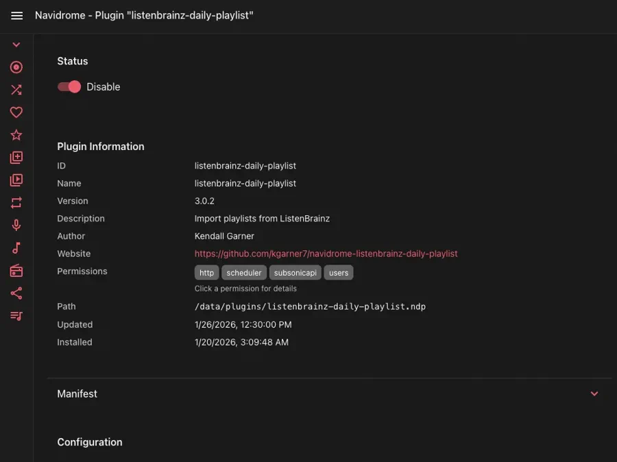 Plugins.AutoReload = trueconfigured, the plugin will be detected automatically.Enable the plugin: Go to the Navidrome web UI, navigate to the Plugins section in the admin area, and enable the plugin.