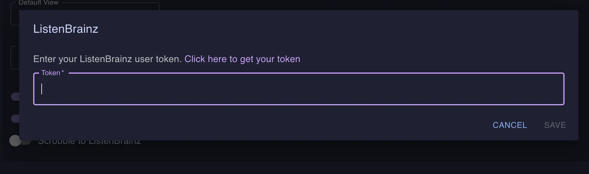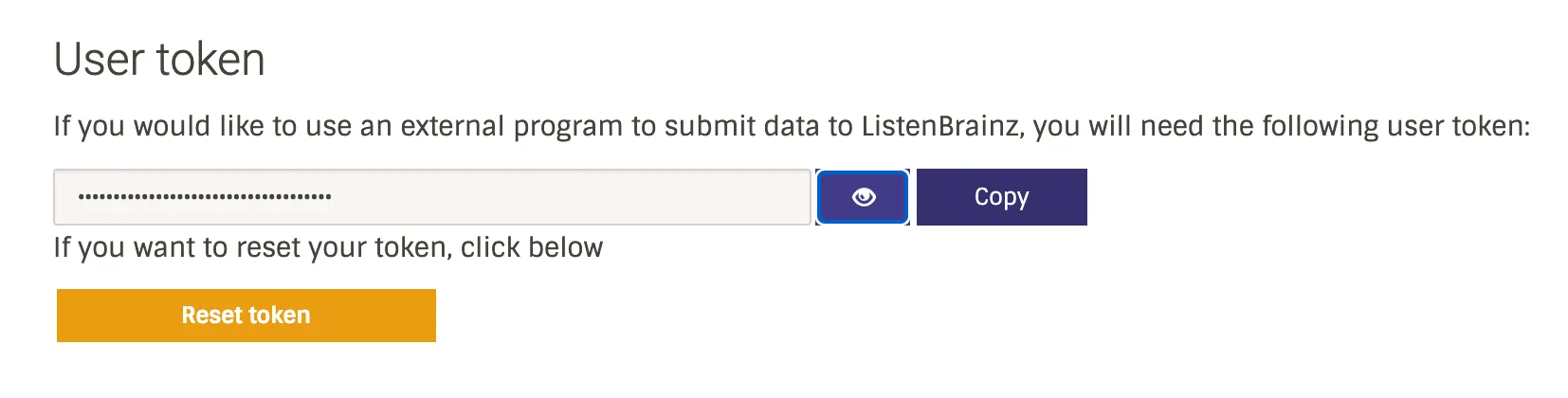 - On the ListenBrainz website, either generate a new token or copy your existing one, then go back to your Navidrome tab.